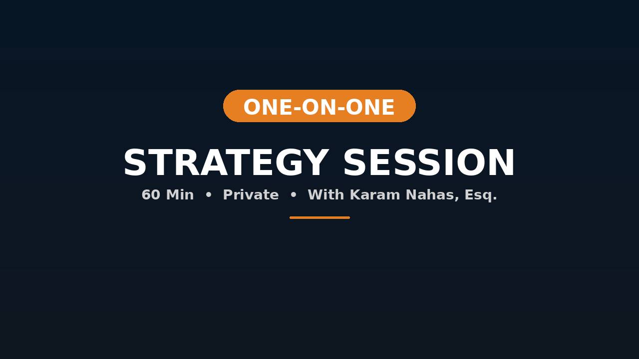 You have questions. I have answers. This is a private one-on-one strategy session with me — Karam Nahas, 20-year BattleTested Lawyer and founder of Legally Bulletproof™. Come with your specific questions about business structure, contracts, client issues, partnerships, compliance, or any of the 7 Danger Zones. Leave with clarity, direction, and a path forward. This session is for you if: → You have a specific situation and need strategic guidance → You're stuck on a decision and want a second opinion from someone who's seen it all → You want to pressure-test your current setup before it becomes a problem → You need clarity on your next move — fast What to expect: → 60 minutes of focused, private time with Karam → Bring your questions — we'll work through them together → No fluff, no upsells during the call — just answers → Walk away with clear action items How to prepare: Before our session, send a brief summary of your situation and your top 2-3 questions. This ensures we maximize our time together. Disclaimer: This session is for educational and informational purposes only. No attorney-client relationship is formed. No legal advice is provided. For legal advice specific to your situation, consult a licensed attorney in your jurisdiction. What You're Getting: ✅ 60-Minute Private Strategy Session with Karam Nahas ✅ Pre-Session Intake to Focus Our Time ✅ Actionable Guidance You Can Implement Immediately